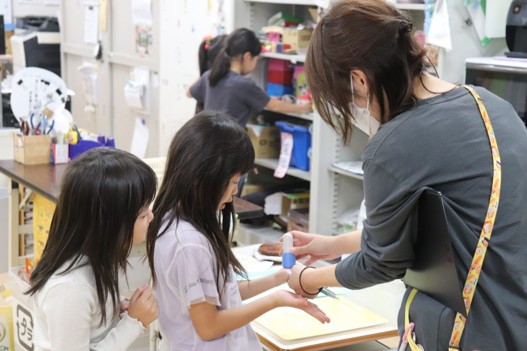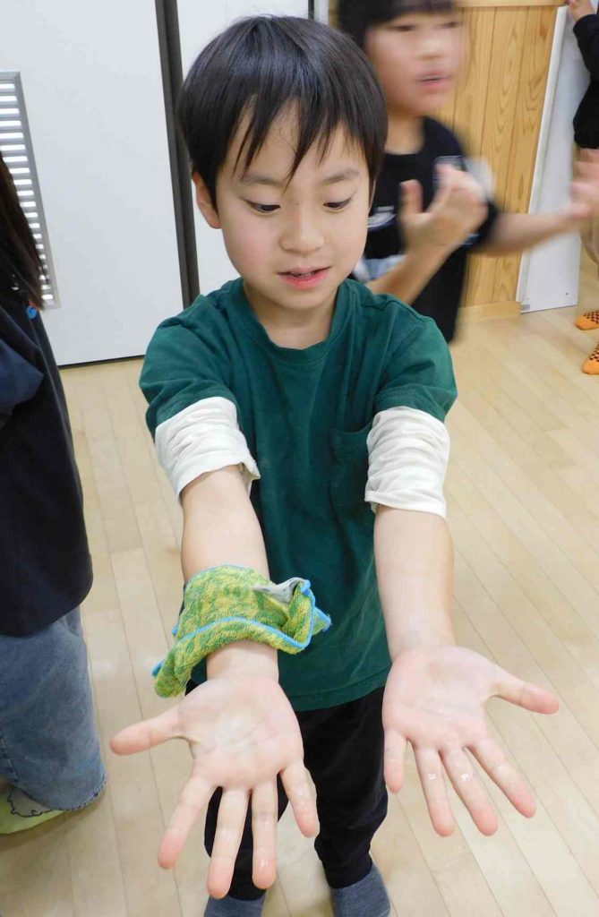 最後に、希望する子どもたちには【手洗いスタンプ】を手に押しました。スタンプがしっかり落ちれば、きちんと手を洗えている証拠になります。あえて汚れの落ちにくい親指の付け根や指先に押しましたが「ちゃんと落ちたよ!」とピカピカの手を見せてくれる子がたくさんいました。
