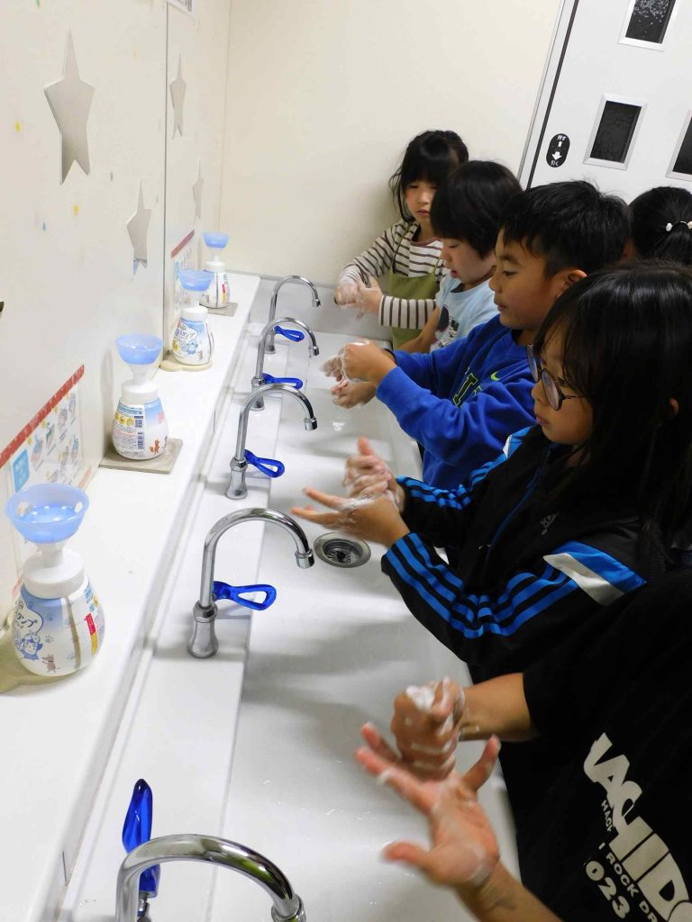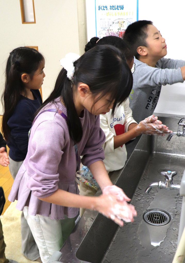 「学童やおうちに帰ってきたら、まず何をする?」という質問に、子どもたちからは「手洗い・うがい!」と元気な声が返ってきました。インフルエンザや風邪の予防には、正しい手洗いが欠かせません。