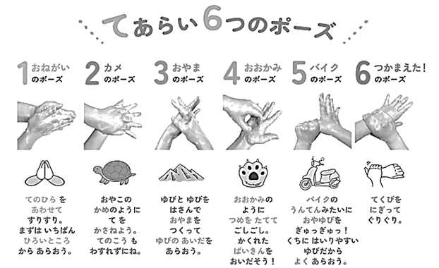 『てあらい6つのポーズ』を紹介しました。このポーズを意識して洗うことで、バイキンをしっかり退治することができます。「ガオー!おおかみ!」「バイクのポーズ、ブンブン!」と、図を見ながらみんなで楽しく手洗いの練習をしました。