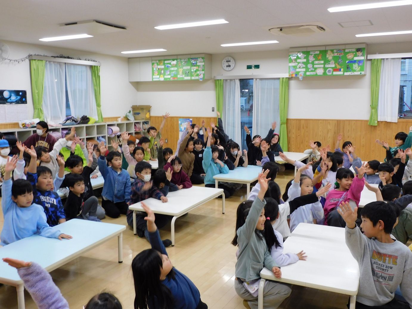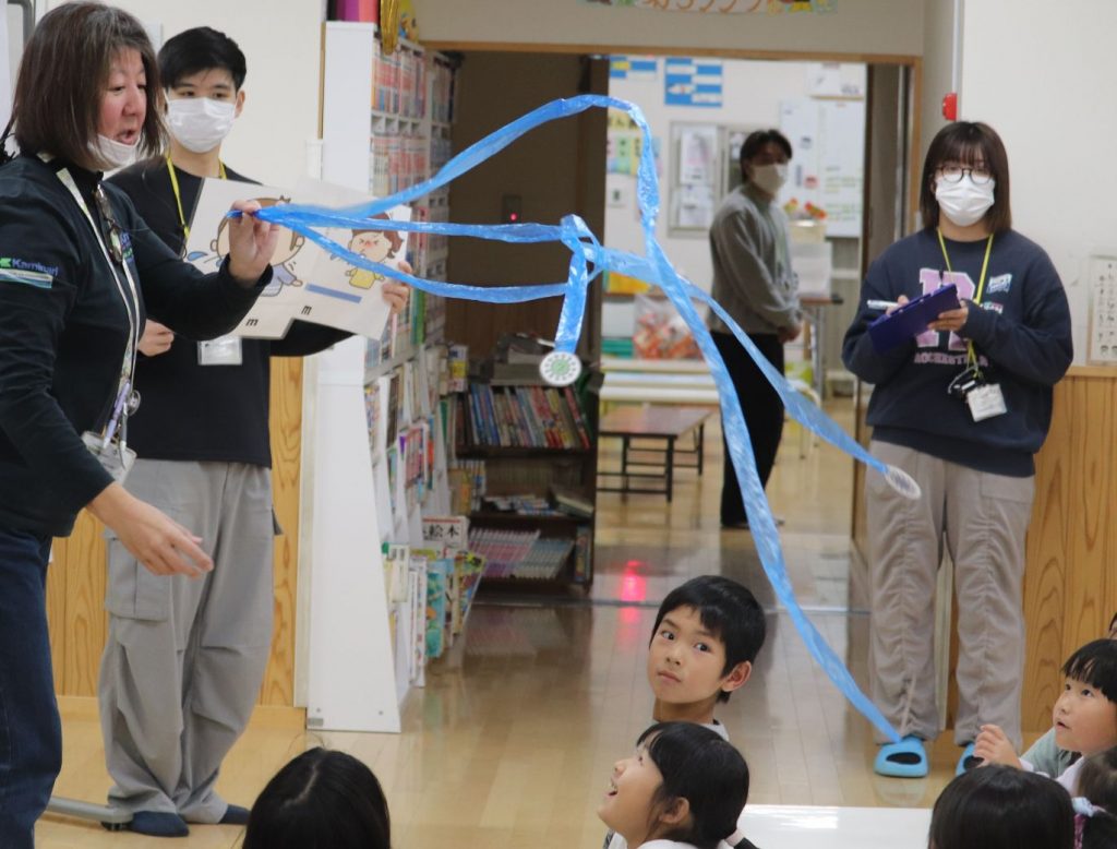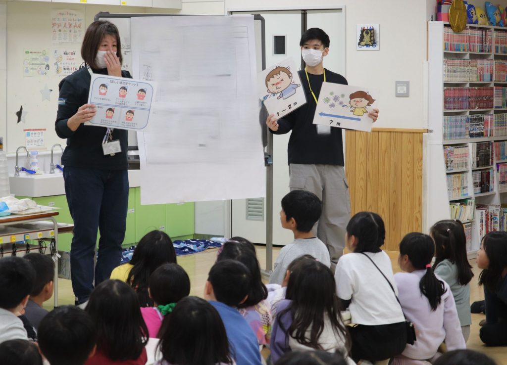 当日は約130人が体育館に集まります。インフルエンザが流行していることもあり【咳エチケット】について話をしました。咳やくしゃみの飛沫は約1mから2m程飛ぶと言われています。同じ長さに切ったスズランテープを飛沫に見立て、こどもたちに見てもらいました。「ながっ!私たちの方まで来たよ!!」「結構遠くまで届いちゃうじゃん!」と驚いた様子。くしゃみや咳症状がある場合はマスクの着用、とっさの場合は服やハンカチで口元を覆う等々、周りの人に感染させない方法についても伝えました。