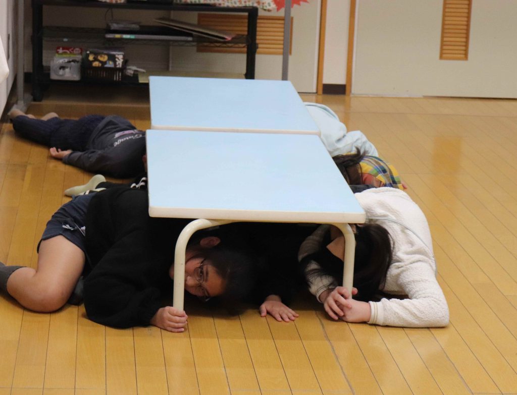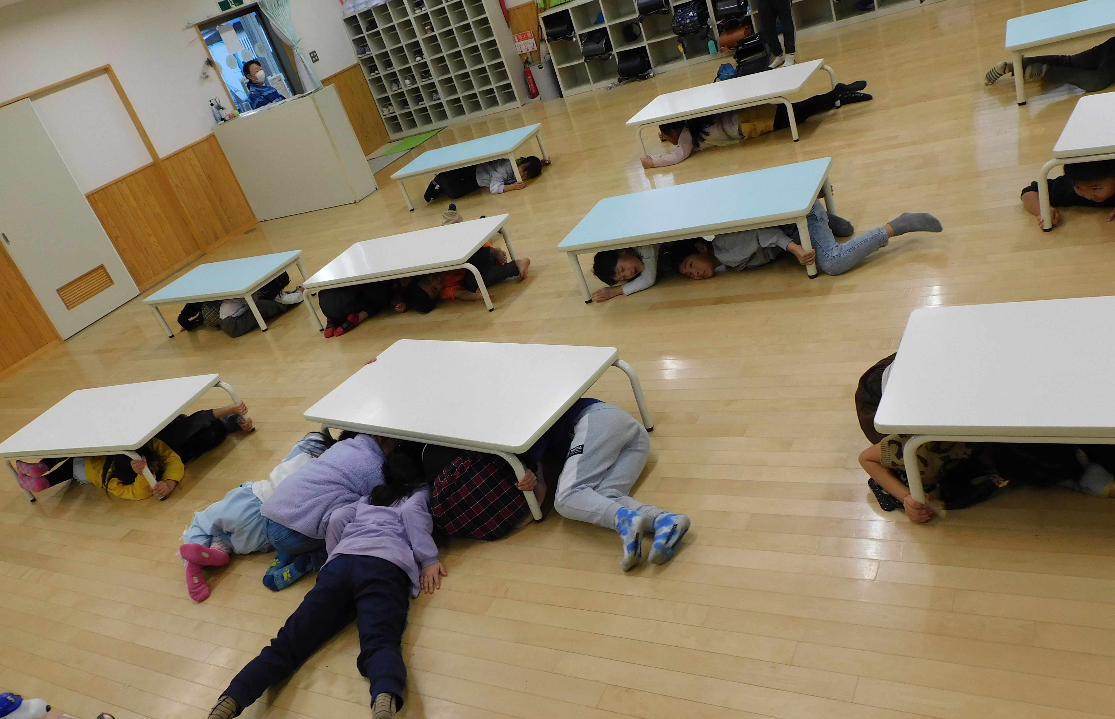 防災訓練 1/14(水) 第四小学童保育所第1・2クラブ 2026.01.28 地震ついて話をした後に各クラブで机の下に潜り頭を守る練習、校庭への避難も行いました。第1、第2クラブともにおしゃべりせず真剣に取り組み、避難ができました。