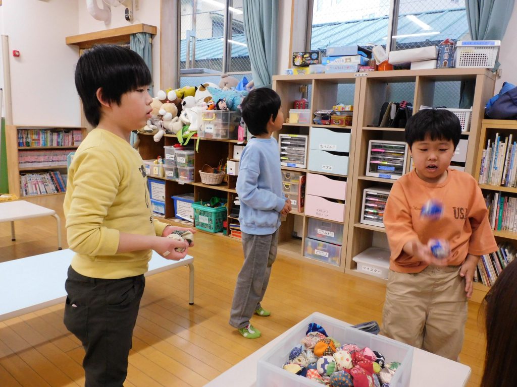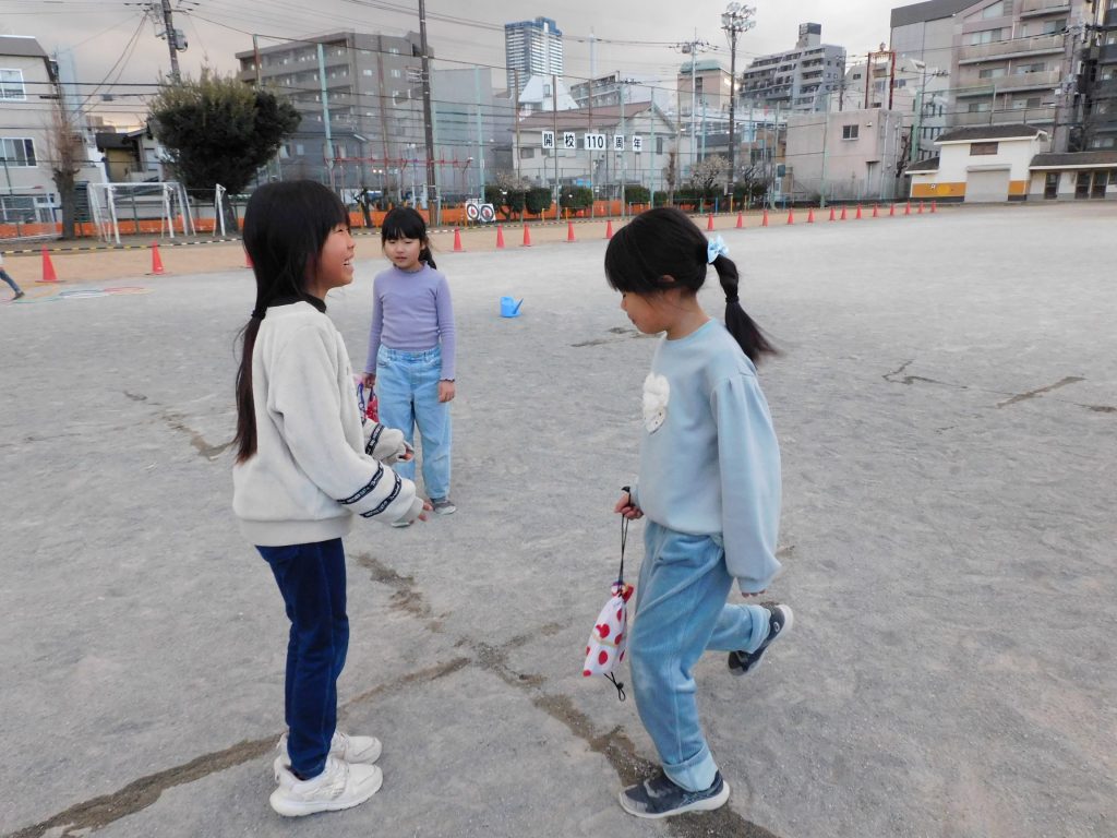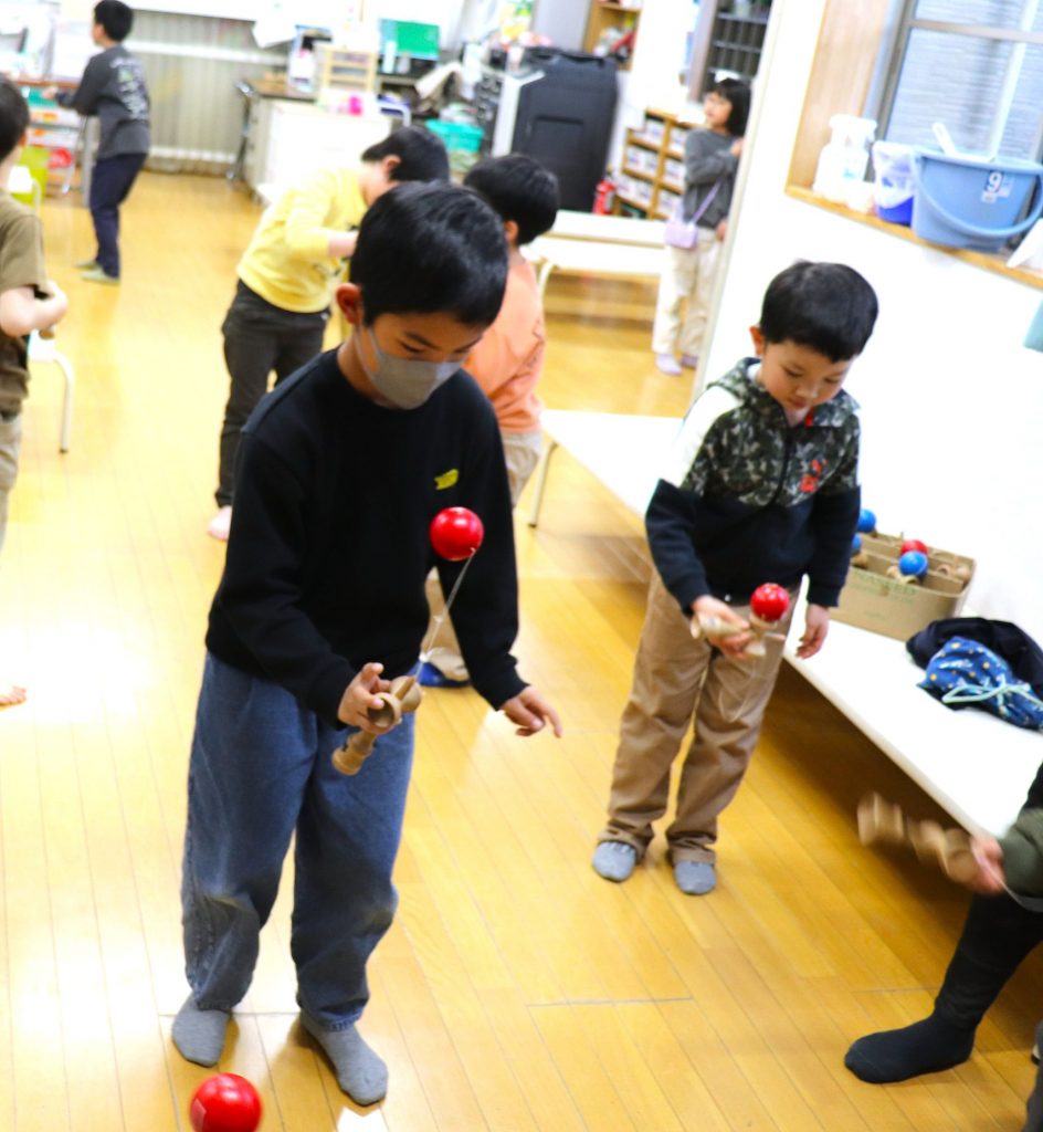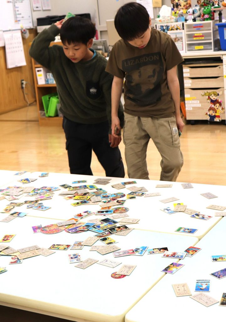 「3、2、1、ゴー…シュート!」コマのコーナーでは、大きな掛け声が聞こえ、白熱したバトルを繰り広げていました。けん玉・お手玉・コマは、名人級を目指して1/28(水)に検定を行います。早くも検定表を見ながら練習する子が多くいました。一番人気は福笑い!終始笑い声が響き渡っていました。「メンコ、1回投げただけで2枚ゲットした」「あんたがたどこさ9回成功したよ!」「カルタ、こんなに取れた」と、たくさんの笑顔が見られ、楽しいひと時となりました☆